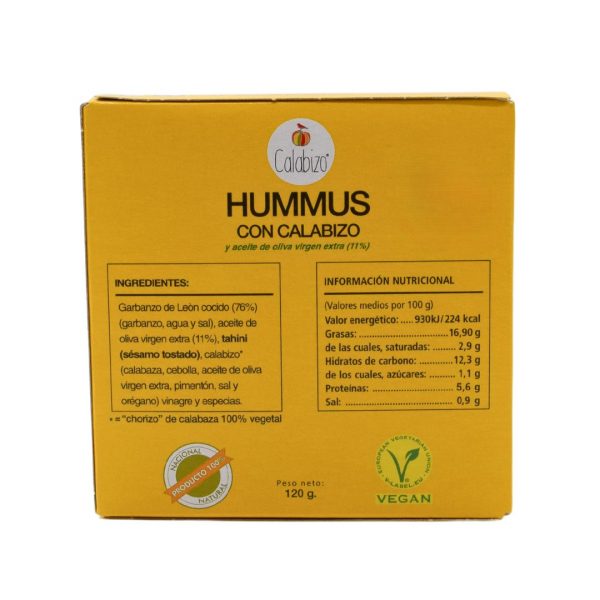 Garbanzo de León cocido (76%) (garbanzo, agua y sal), aceite de oliva virgen extra (11%), tahini (sésamo tostado), calabizo (calabaza, cebolla, aove, pimentón, sal, ajo y orégano), vinagre y especias.