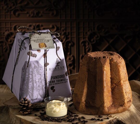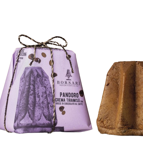 El Pandoro con Crema de Tiramisú y Gotas de Chocolate es uno de los pasteles navideños más populares, que aprovecha las bondades naturales del chocolate y el tiramisú y los combina en una mezcla única. Elaborado con mimo a partir de levadura madre que suaviza la masa, se rellena con una crema de tiramisú, a base de huevos y mascarpone, y se enriquece con pepitas de chocolate con sabor a café.